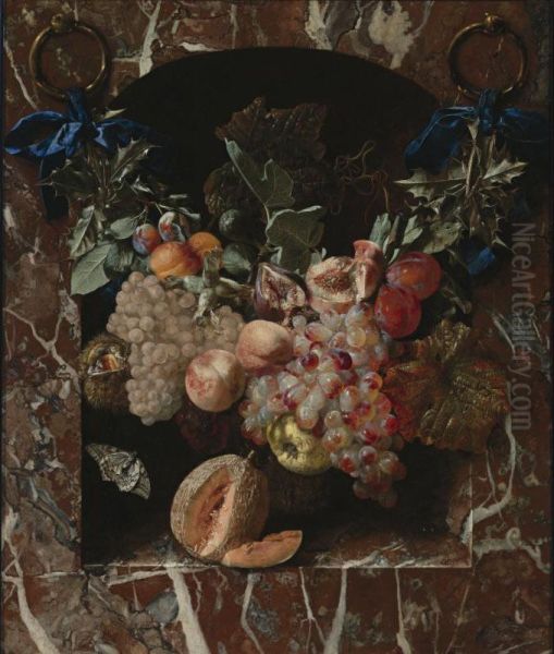 A Festoon Of Fruits, Including Peaches, Grapes, Plums And Hazelnuts, Suspended By Blue Ribbons Before A Marble Niche, With A Melon Resting On A Ledge Below