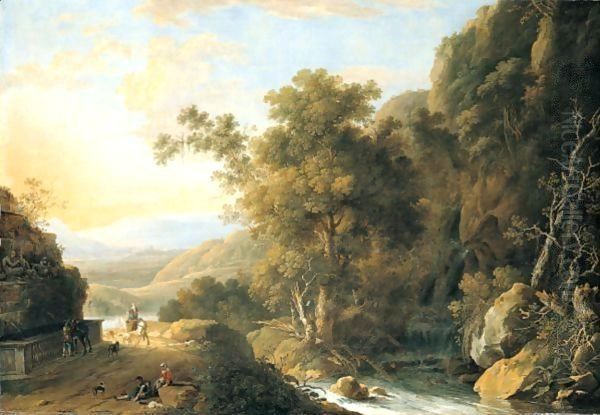 Southern Landscape With Travellers And Animals Beside A Fountain Near A Waterfall