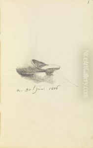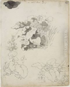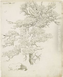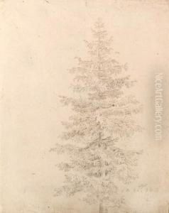 Hugellandschaft mit vier hochstammigen Fichten, darunter Zweig mit Blattern