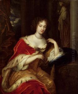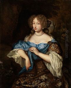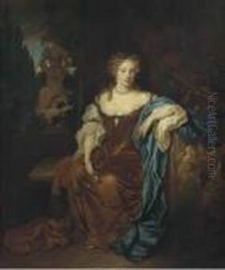 Portrait Of A Lady, Seated Three-quarter-length, In A Grey Silkdress With Lace Chemise, Blue Wrap And A Pearl Necklace, Holding Abranch In Her Left Hand, A Lamb At Her Side