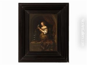 A Lady Seated In An Interior With A Spaniel On Her Lap, A Servanttending Her Hair