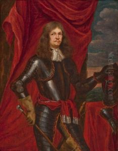 Portrait Of A Field Marshal, Three-quarter-length, In A Cuirass, A Marshal's Baton On The Table Beside Him, A Battle Beyond