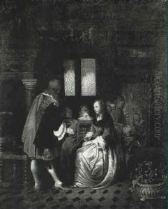 A Lady Seated In A Blue Bodice With A Gentleman And A Boy With A Parakeet