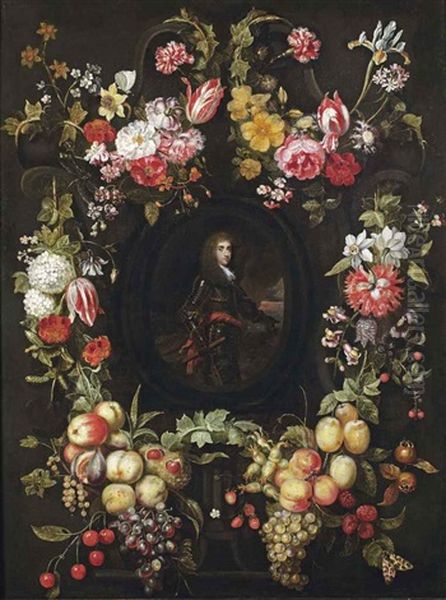 Portrait Of An Officer, Three-quarter-length, In Armour, Holding A Commander's Baton, A Coastal Cavalry Battle In The Background...
