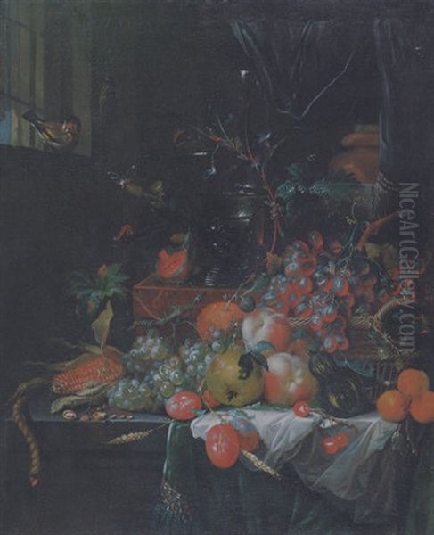 Grapes In A Basket, A Corn Cob, Various Fruit, A Roemer And A Wine Flute On A Chest, A Lit Taper On A Draped Stone Ledge And A Chaffinch In A Window