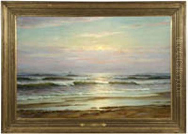 Off The Virginia Coast, Coastal View At Sunset With A Distant Clipper Ship