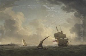 A Royal Navy Fourth Rate Heeling In The Breeze In The Channel, Running Past The Entrance To Plymouth Sound, With Other Warships And Local Craft Nearby