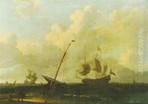 Dutch Fishing Kaags By A Shore, With A Man Of War Saluting