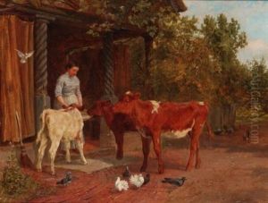 Farmyard Scene, With Woman And Boy Watching A Cow And Calf With Doves And Hens