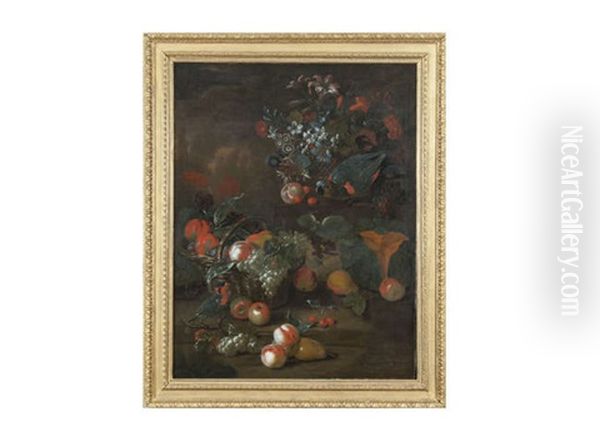 Still Life With A Basket Of Flowers And Two Parrots On Steps