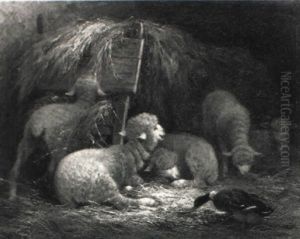 L'interieur D'une Bergerie Avec Des Moutons, Des Agneaux, Un Coq Et Une Poule