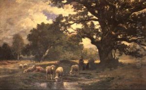 Shepherds With Their Flock In A Wooded Landscape