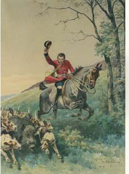 "chasse Du Sanglier A Courre . L'animal Coiffe Par Les Chiens".