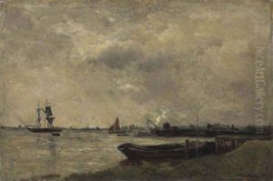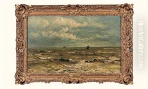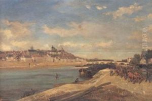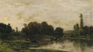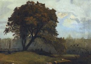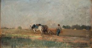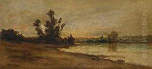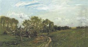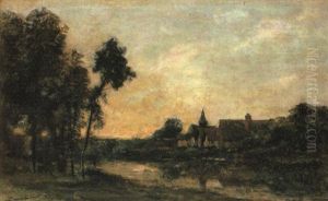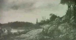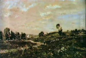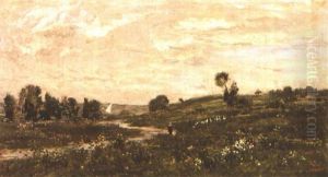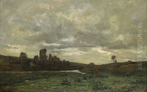 A Stormy Landscape With Figures In A Field And A View Of A Village
