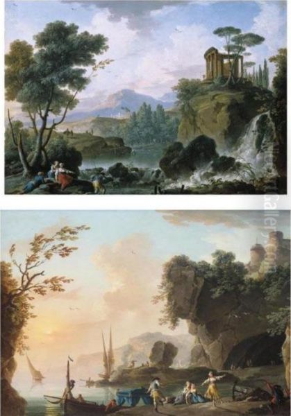 A Capriccio Landscape With Tivoli, The Temple Of Vesta And A Waterfall, A Fisherman And Other Figures In The Foreground; A Coastal Rocky Landscape At Sunset With Figures Dancing Before A Cave