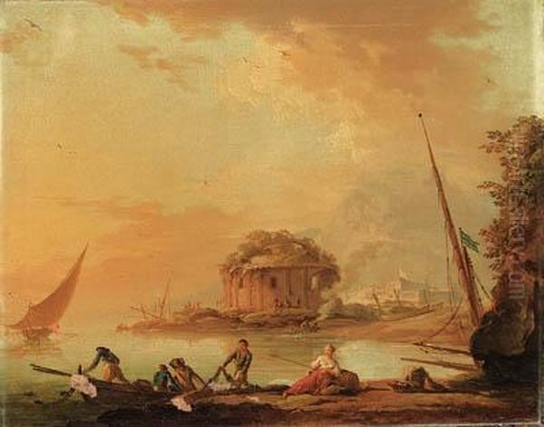 Fisherfolk Pulling In Their Nets At Dusk By A Mediterraneanharbour, A Classical Ruin Beyond