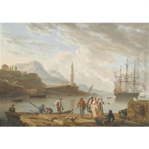 A Port Scene With Elegant Figures Embarking (+ A Port Scene With Fishermen Hauling Nets; Pair)
