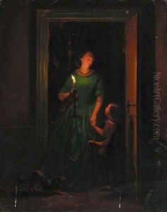 A Mother And Child At A Candlelit Doorway