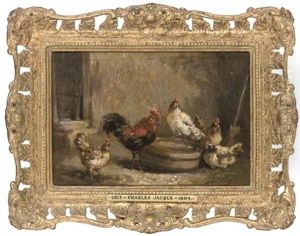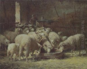 Pastoral Scene With Sheep Watering, Shepherd And Collie Looking On