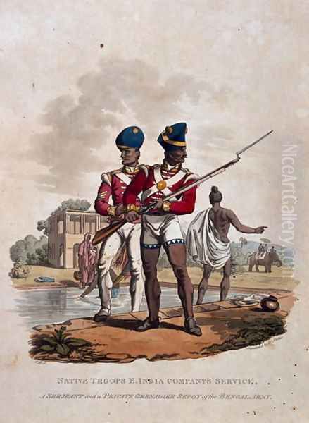 Native Troops, East India Companys Service, A Sergeant and a Private Grenadier Sepoy of the Bengal Army, from Costumes of the Army of the British Empire, according to the last regulations 1812, published by Colnaghi and Co. 1812-15