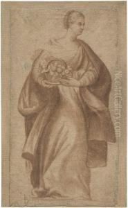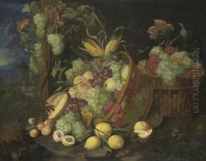 Still Life Of Table Laden With Fruit, Basket And Compote With Landscape Background