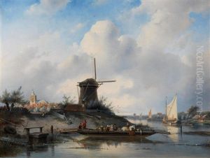 Winterlandschap met figuren op een bevroren rivier bij een toren