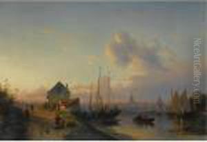 Figures On A Barge Near A Waterside Village