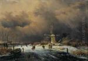 A Frozen Waterway With Figures On The Ice, A Windmill In The Distance
