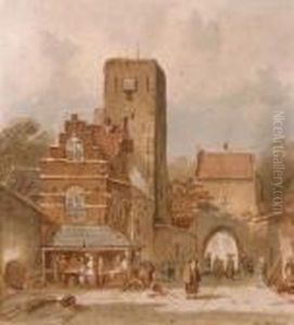 A Town View With Figures By A Market Stall