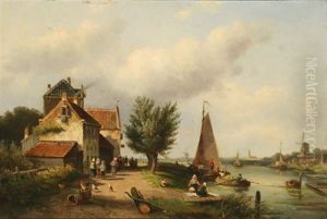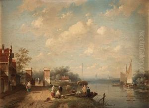 A Sunlit River Landscape With Townsfolk On A Ferry