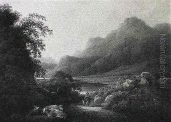Romantisk Landskab, I Forgrunden Kvaeg Og Gaende Pa En Vej