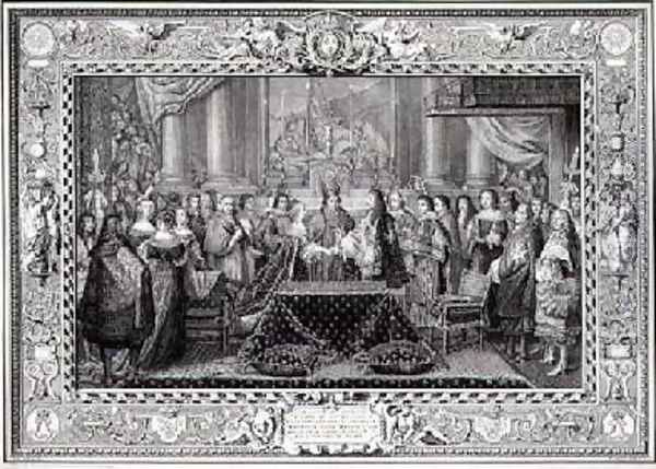 Bring the timeless beauty of Charles Le Brun's Marriage Ceremony of Louis XIV 1638-1715 King of France and Navarre and the Infanta Maria Theresa of Austria 1638-83 daughter of Philip IV King of Spain in 1660 into your home with a handmade oil painting reproduction. Carefully recreated on canvas by skilled artists using traditional techniques, this piece captures the delicate brushwork, subtle light, and vibrant color of the original masterpiece. With museum-level quality and rich texture, it brings elegance and artistic depth to any space. Enjoy free shipping and make this masterpiece a part of your personal collection.