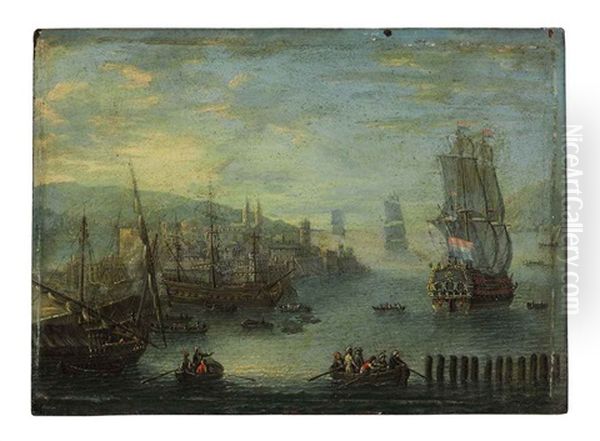 A Port With Moored Ships, Rowboats And A Man-of-war