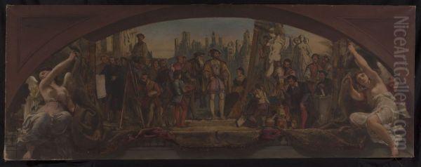 Esquisse pour le pavillon Denon au Louvre : Les quatre ages de la vie artistique en France - Presentation a Francois Ier des plans du chateau de Fontainebleau