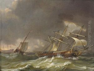 An English Frigate Running Through Crowded Waters In A Heavy Swell (+ Warships Offshore With A Dutch Hoy Pulling Away From A Jetty In Choppy Seas; Pair)