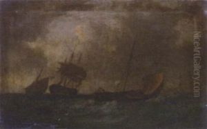 Dutch Sailing Ships In A Stormy Sea, A Rowing Boat Alongside