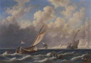 Off The Dutch Coast - Barge, Rowboat And Fishing Boats And A Naval Vessel In A Fresh Breeze