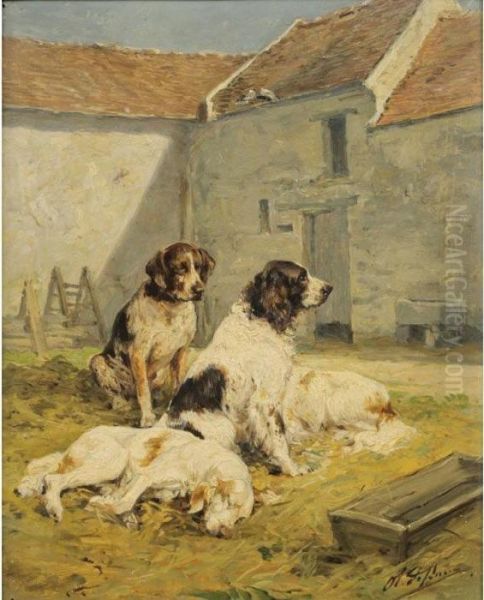 Chiens Dans Une Cour De Ferme [; Dogs In The Courtyard Of A Farm, Oil On Panel, Signed.]