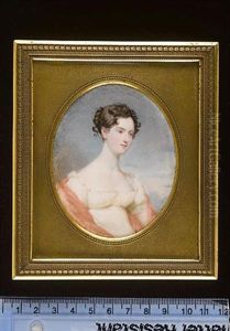 A Young Lady Wearing Elaborate White Dress, With Blue Ribbon About Her Shoulders And Held With A Flower At Her Corsage And Yellow Waistband