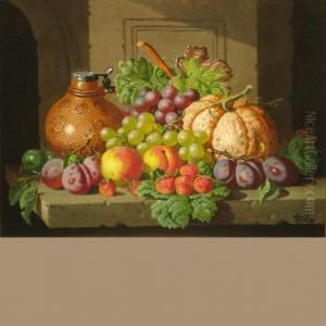 Still Life Of Fruit And A Stoneware Bellarmine On A Stone Ledge