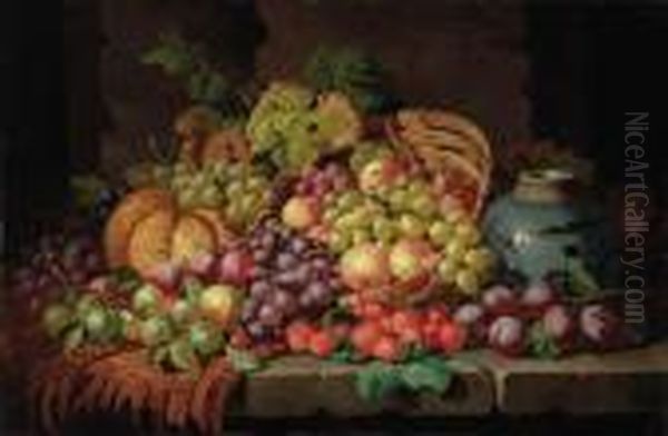 A Basket Of Grapes, Plums, Peaches, Strawberries And A Melon With A Jar On A Draped Stone Table