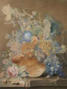 Grapes, apples, pears, plums, a gourd, and a stoneware tankard, on a ledge