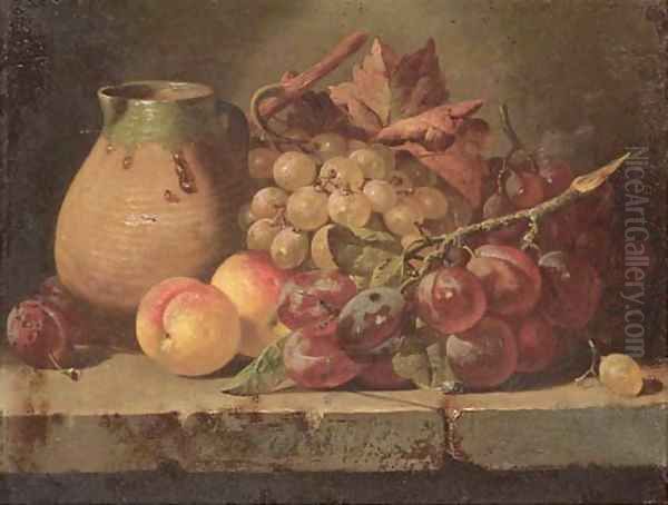Grapes, plums, and peaches with a jug on a ledge