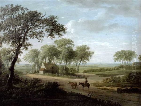 A Drover With Cattle On A Track, A Cottage Beyond