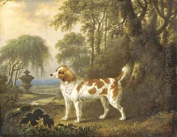A Marlborough spaniel in a wooded landscape, an urn beyond