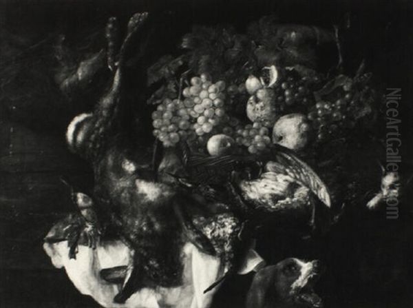 Still Life Of Basket Of Fruit And Game On Ledge With Cat And Hound