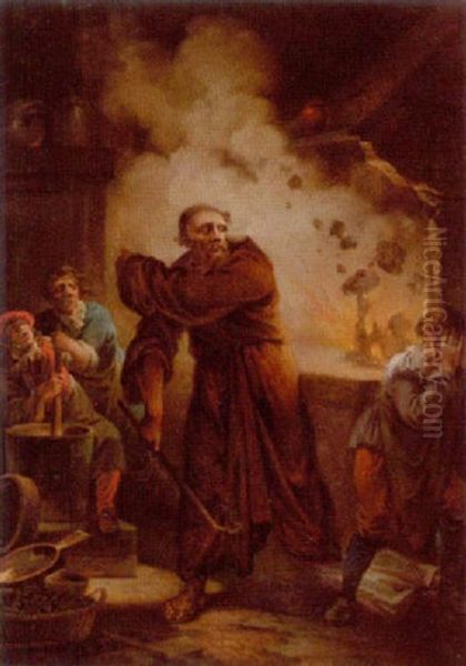 Den Tyske Munk Auerbach I Sit Vaeksted Eksperimenternde Med Opfindelsen Af Krudtet