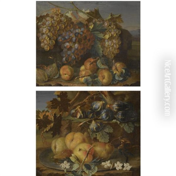 A Still Life Of Grapes On The Vine, Plums And Peaches In A Landscape (+ A Still Life Of Peaches And Pears On A Silver Tazza, Together With Figs; Pair)