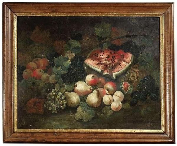 Grapes, Peaches, Pears And A Melon. Baroque Frame. Oil/canvas/canvas