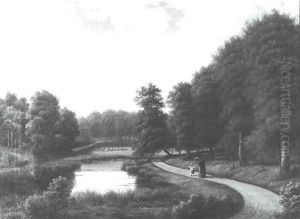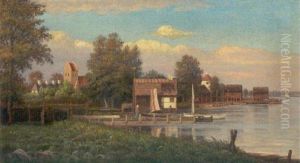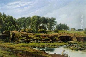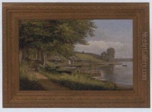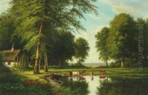 Landskab Med Kvaeg Ved En Skovso, I Baggrunden Landsbykirke